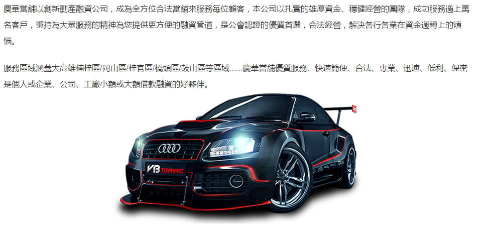 - 慶華當舖專業提供梓官區、橋頭區、鼓山區汽車借款,機車借款,免留車,船舶借款,船外機借款,船釣工具借款,合法立案經營當鋪,審核容易,全程保密免保人,貸您度過難關,解決您資金需求。